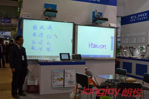 在展位醒目的位置展出的就是本次朗悅科技自有品牌新品——Lv-1082電子白板。該產(chǎn)品采用紅外感應(yīng)技術(shù),可使用手指或其他任何物體進(jìn)行觸摸書寫。白板尺寸為82英寸,顯示比例為4:3,可直接安裝于普通組合黑板。