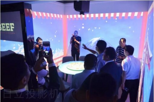 日立創新影像空間充分利用開闊空間,創造了面向商業、教室、家居等各種應用的精彩方案:迎接賓客的階梯投射與前臺墻面投影令人倍感親切,適合商業應用的8K巨幕廣告墻、酒瓶異形廣告牌方案引人矚目;面向美術館、音樂廳的變換燈、LED投影與鋼琴Mapping方案則極具創意;適合商業樣板間和家具商場的軌道鏡Mapping意趣盎然;模擬高爾夫球方案則是成熟的商業應用。觀景窗、地面廣告、豎投廣告等方案是創意與商業的精彩結合;數字餐廳實現視覺與味覺的巧妙融合;智能投影壁燈適合打造創意方案;模擬教室不僅有超短焦激光投影新品的交互方案,還有新型錄播系統,備受關注。
