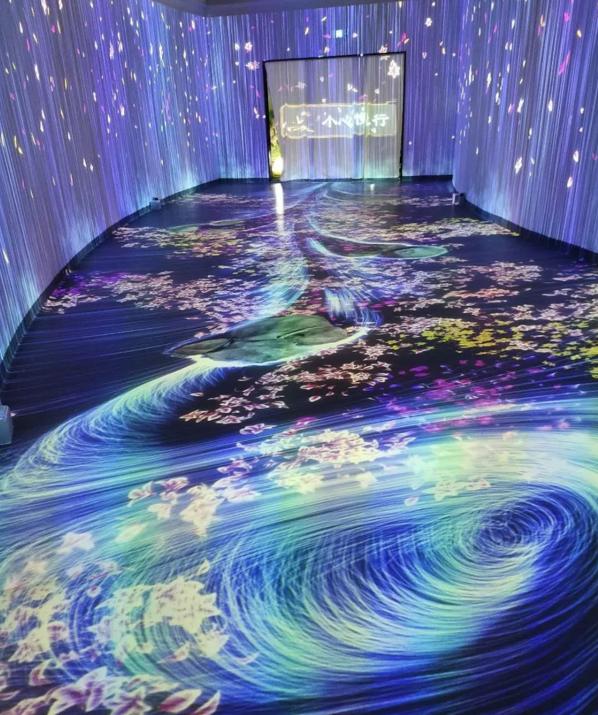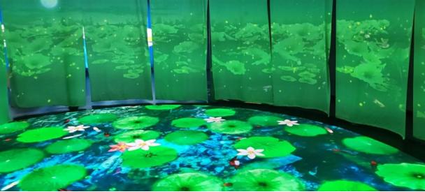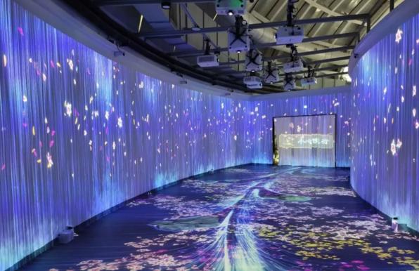 互動展區(qū),麥克賽爾DLP激光工程投影機再次展現(xiàn)了投影魅力,呈現(xiàn)了一場沉浸式互動體驗光影展。環(huán)形排列的感應玻璃,顯示出波瀾不驚的水面,觀眾用手將其連接,江湖瞬時連通,水中魚兒暢游、水母綻放。
